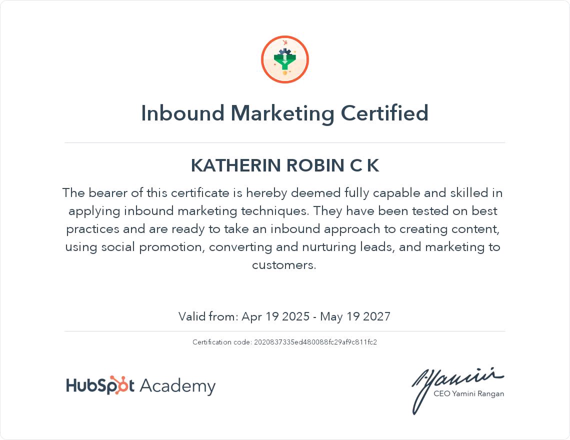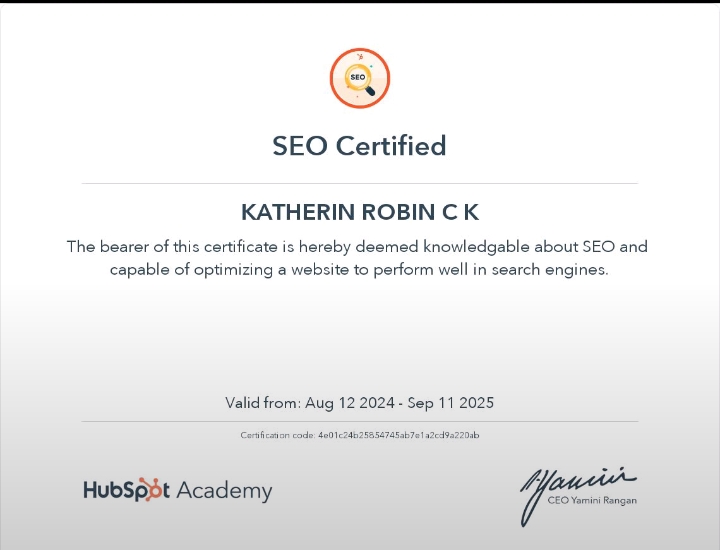 Learning digital marketing under KATHERIN ROBIN CK ma'am has been a truly inspiring experience. As someone who transitioned into this field from a healthcare background, I was initially unsure of how I would adapt. But Ma’am’s teaching style made everything clear, practical, and engaging. She doesn’t just teach theory—she shows us how to apply it in real-world scenarios, which has boosted my confidence and skill set tremendously. Her passion for the subject, constant encouragement, and deep industry knowledge have made a huge impact on my journey.